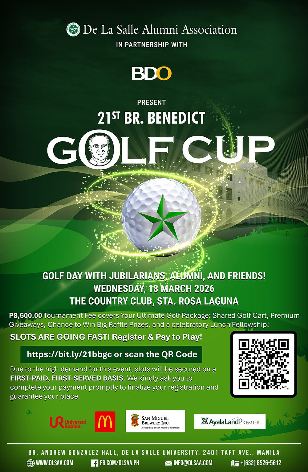 The DLSU Accounting Graduates Homecoming, "A Ledger of Legacies," scheduled for July 26, has been postponed to September 20, 2025, due to inclement weather and flooding in Metro Manila and nearby provinces. Register using the QR code or link: https://bit.ly/ALedgerOfLegacies-DLSU