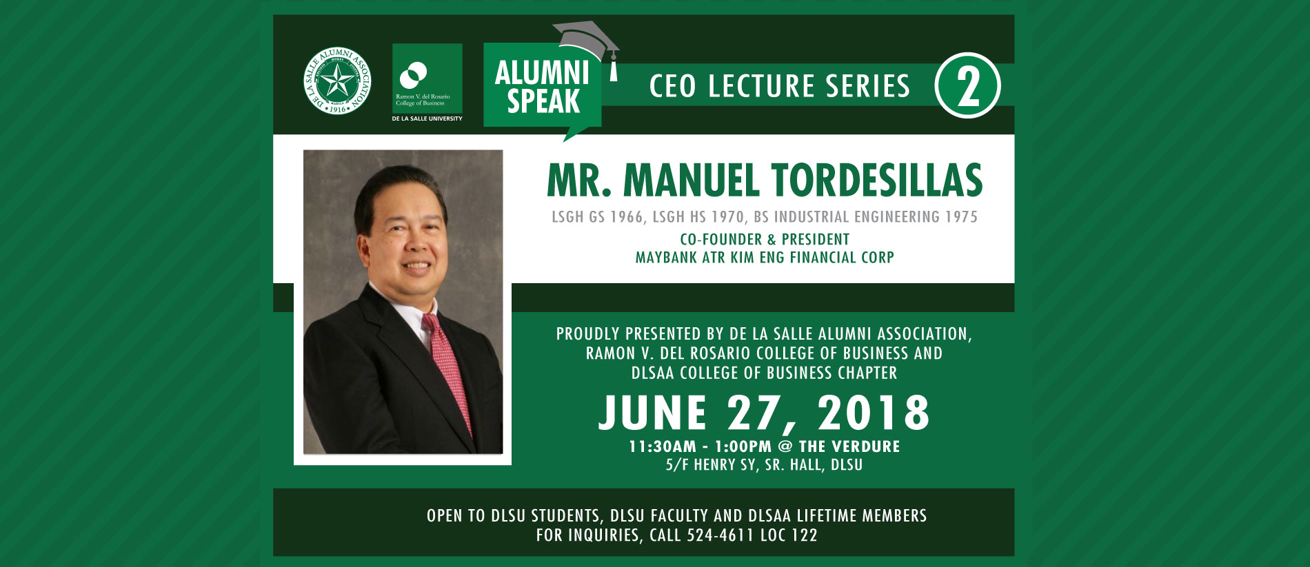 "Alumni Speak" is a series of talks by prominent alumni CEO, initiated by the DLSAA in partnership with the various colleges and departments of DLSU. The main objective of the activity is to engage the students with our notable and distinguished alumni in various fields of expertise, as well as encourage closer collaboration with the faculty.